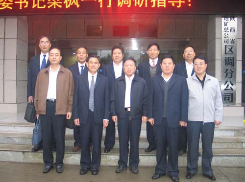2012年10月16日上午,陜西地礦總公司董事長、黨委書記梁楓同志在發展規劃部主任白志宜、生產經營部主任蒙小記的陪同下,冒雨來到我公司調研檢查指導工作。