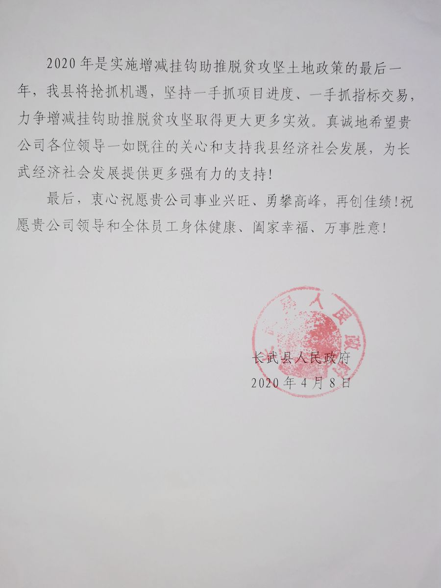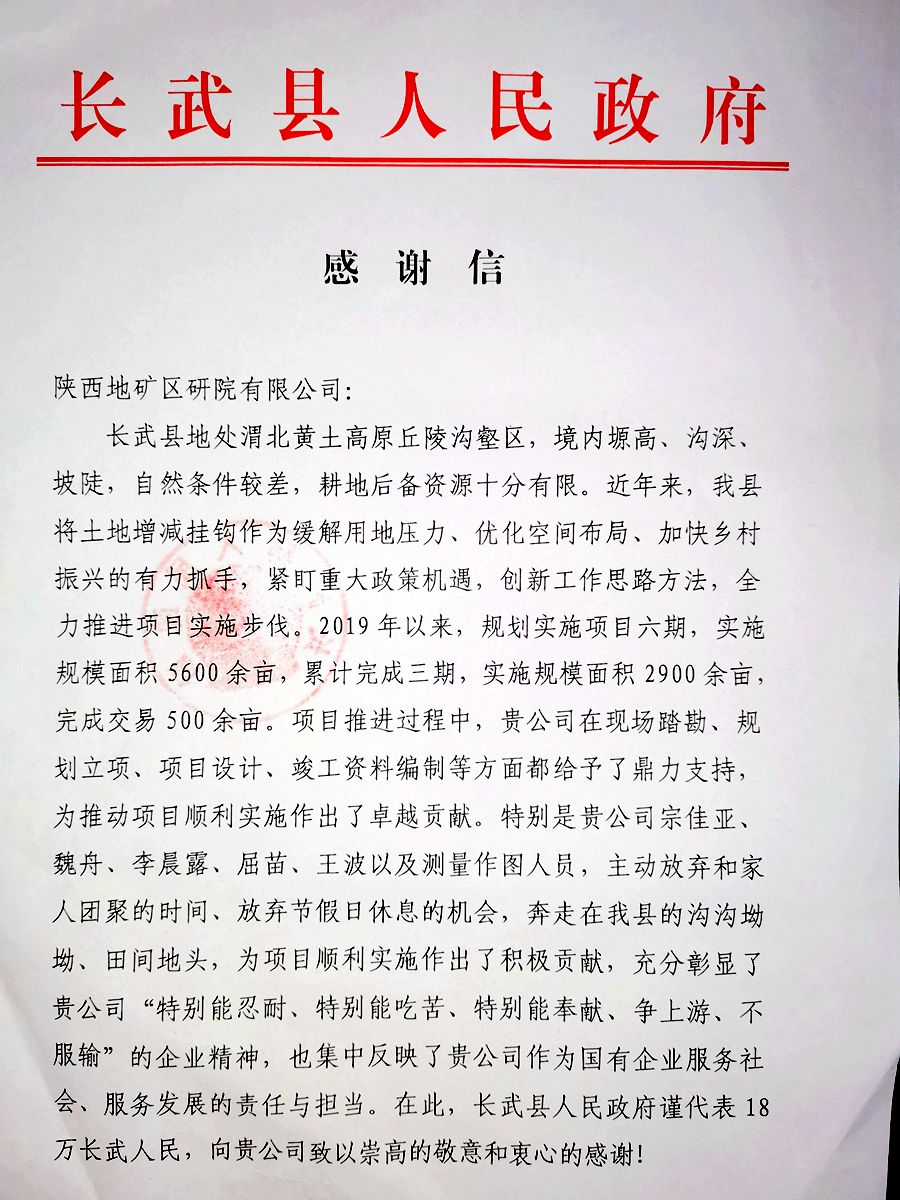 近日,長武縣人民政府給陜西地礦區研院有限公司送來感謝信。感謝我單位重視土地增減掛鉤項目,投入精兵強將,克服諸多困難,發揚“特別能忍耐、特別能吃苦、特別能奉獻、爭上游、不服輸”的企業精神,在項目推進過程中,在現場踏勘、規劃立項、項目設計、竣工資料編制等方面給予了鼎力支持,特別是宗佳亞、魏舟、李晨露、屈苗、王波等同志,放棄休息時間,奔走在長武的田間地頭,展現了區研院人的良好精神面貌。陜西地礦區研院有限公司作為國企,體現責任擔當,為長武脫貧攻堅作出積極貢獻。(白宏偉 舒萌萌)